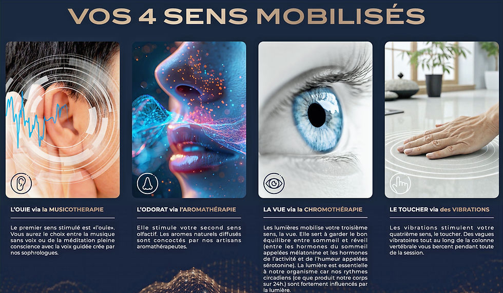 La chromothérapie (colorée en cours de séance, puis blanche en fin de séance pour “réveiller” le corps, la lumière sert à garder le bon équilibre entre sommeil et réveil)